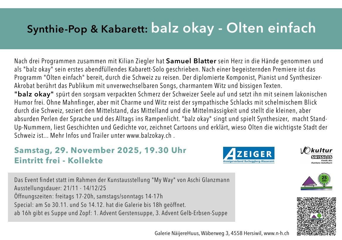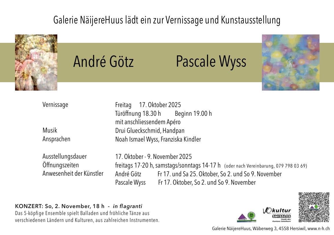 Bei Anlässen in der Galerie NäijereHuus gibt es keinen Ticket-Vorverkauf, da der Eintritt frei ist (Kollekte). Es ist jedoch möglich Plätze zu reservieren. Bitte füllen Sie dazu das Formular unter dem Menüpunkt "Platzreservation" aus. Wir freuen uns auf Ihren Besuch!