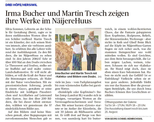 Die „schmackhaften“ Bilder der 5 Künstler: Verschlungene Formen oder zeichenartig begrenzte Flecken in starken oder abgedunkelten Farben malt Ismael Loosli (Bern), meist auf Papier; mit Neocolor, Wortbildern und ausgewählten Fotos konstruiert Berti Baumgartner (Solothurn) farbige Welten zu hintergründigen Themen auf Holztafeln; sinnliche, schwungvoll gestaltete grossflächige Kreidebilder stehen bei Romana Gfeller (Solothurn) im Gegensatz zu den grellen Werken, die mit Neonacryl gemalt sind; eine phantastisch-witzige Serie von Bildern mit Titeln wie „Longdrink“, „“Lebensrad“ oder „Lange Leiter“, die in Encaustic-Technik (Wachstechnik) „gespachtelt“ sind und geometrisch gestaltete Acrylbilder zeigt Bruno Portmann (Gerlafingen); im Haus und vor allem im Garten stehen naturbelassene Holz-Stelen, die Hugo Flury gedrechselt und auf Eisenstäben zusammengestellt hat.In welchem Rahmen, in welchen Werkstätten und Ateliers die Werke entstanden sind, erklärten Ruth Loosli (Mutter von Ismael) und Willi Ingold (Betreuer im solodaris) den 80 Vernissagegästen. Für die musikalische Umrahmung sorgte mit starken Sounds die solodaris-Jam-Band.Die Werke sind noch bis am 5. November ausgestellt.